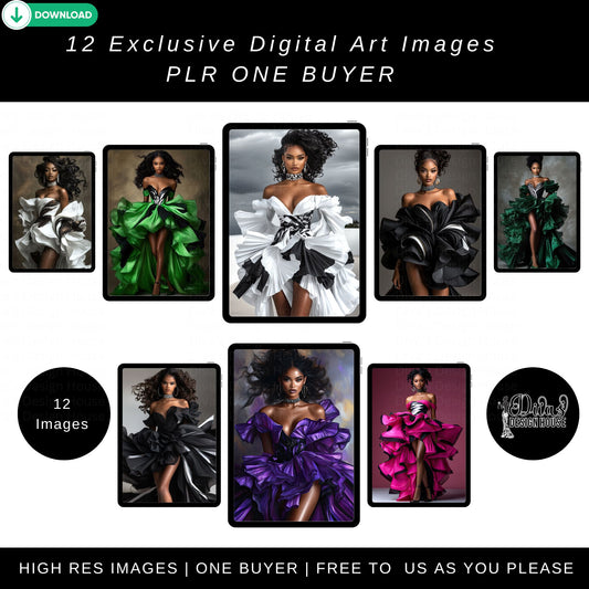 Embracing Luxury Black Woman Art Bundle | 12 High-Res Fashion Illustrations | Digital Download with PLR | Glamorous African American Clipart for Canva, T-Shirts & Affirmation Cards